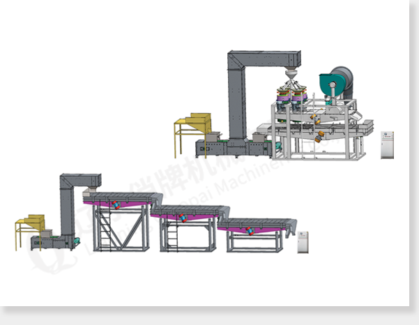 Sizing Unit: input hopper, elevator, sizing screen.(the quantity of sizing screens varies with the raw materials)